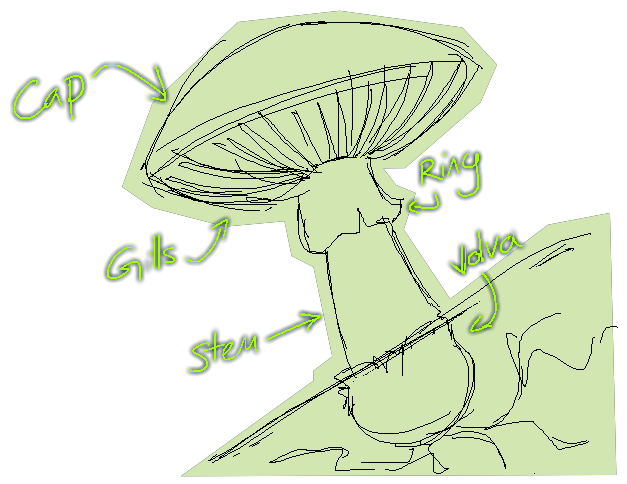 Mushrooms are the fruiting body found on fungi including a stem, a cap, and gills.
